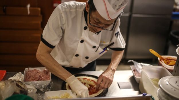 Now he is a full-time kitchen worker making salads and pizza at Gingko's flagship restaurant, which serves both Chinese and Western food.